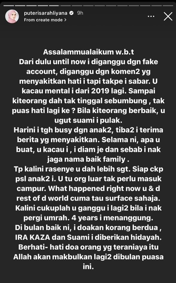 “Anda kacau mental saya dari 2019 lagi. Sampai kami (Puteri dan Syamsul) dah tak tinggal sebumbung, tak puas hati lagi ke? Bila kami berbaik, anda ugut suami saya pula.