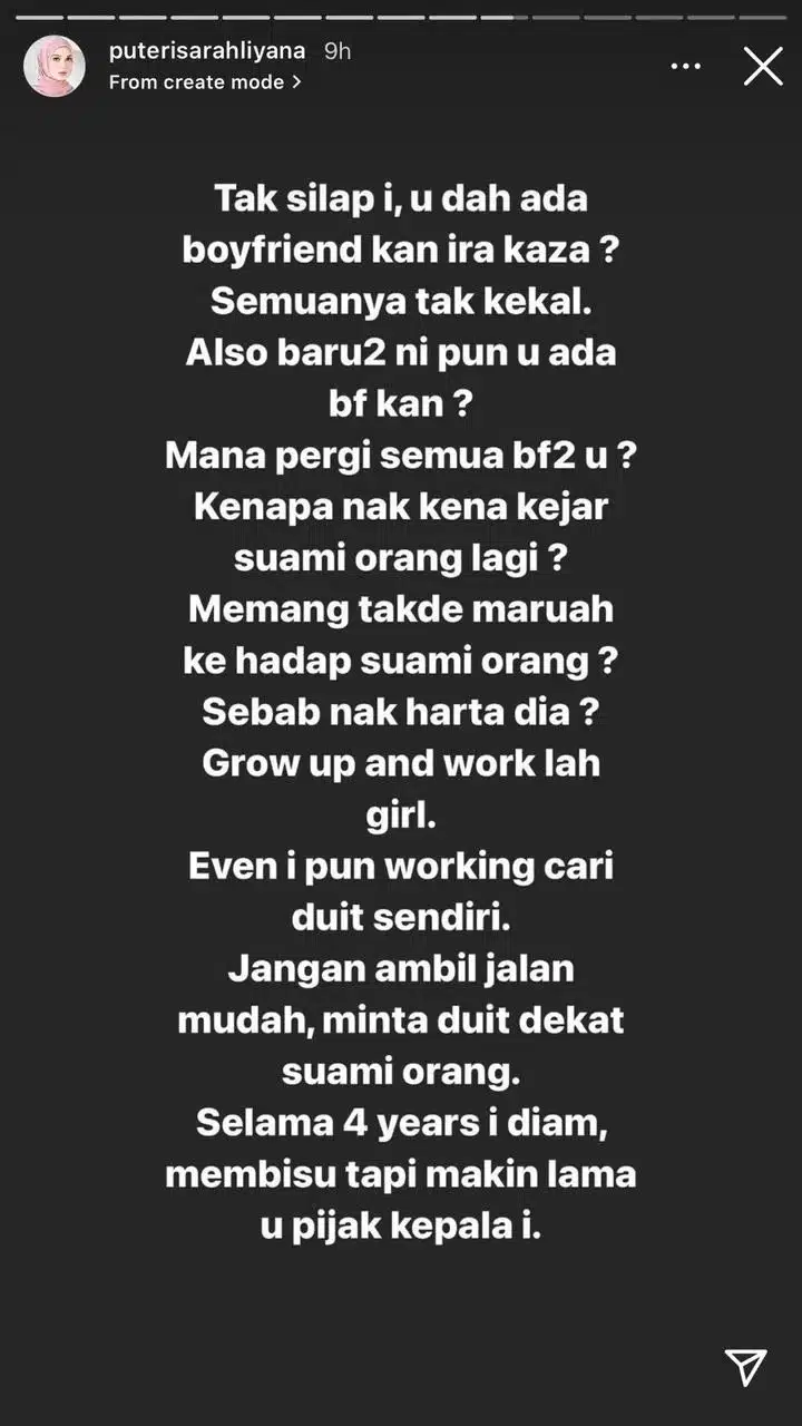 Dalam hantaran berbeza, Puteri turut mempertikaikan tindakan Ira Kaza yang dikatakan tidak putus asa mengganggu suami orang.