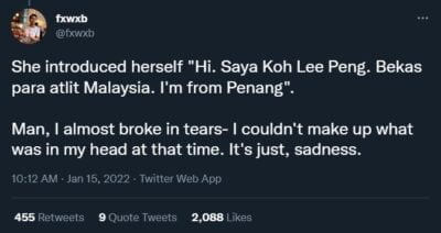 “Tahun lalu, walaupun saya tidak lagi berada di KBS, saya bekerja dengan sebuah NGO untuk menderma RM5k kepadanya,” tweetnya , sambil menambah bahawa dia akan menyemak sama ada bantuan bulanan KBS masih berjalan untuk Koh.