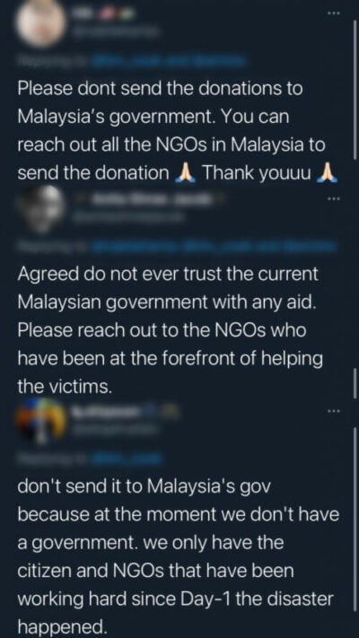 “Jangan sesekali mempercayai kerajaan Malaysia sekarang dengan sebarang bantuan. Sila hubungi NGO yang berada di barisan hadapan dalam membantu mangsa.”