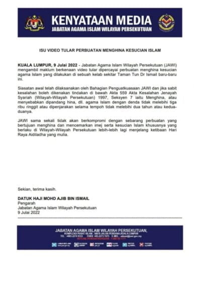 Dalam pada itu, Jabatan Agama Islam Wilayah Persekutuan (JAWI) telah melakukan siasatan awal video tular tersebut dan jika sabit kesalahan boleh dikenakan tindakan di bawah Akta 559 Akta Kesalahan Jenayah Syariah (Wilayah-Wilayah Perseketuan) 1997, Seksyen 7 iaitu menghina, atau menyebabkan dipandang hina agama Islam dengan denda tidak melebihi RM3000 atau dipenjarakan selama tempoh tidak melebihi 2 tahun atau kedua-duanya.