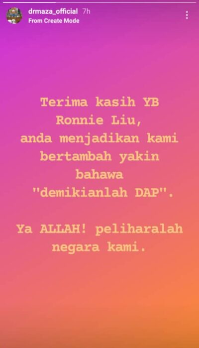Dr Maza menulis “Terima kasih YB Ronnie Liu, anda menjadikan kami bertambah yakin bahawa “demikianlah DAP”. Ya Allah! Peliharakanlah negera kami.
