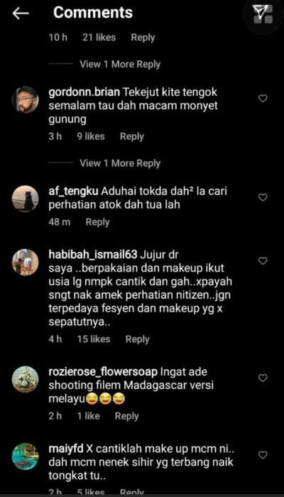 “Jujur dari saya.. Berpakaian dan make-up ikut usia lagi nampk cantik dan gah.. Tak payah sangat nak ambil perhatian netizen. Jangan terpedaya fesyen dan make-up yang tak sepatutnya”.