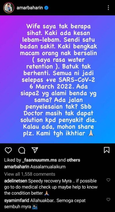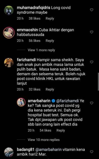 “Batuk tak berhenti. Semua ini jadi selepas positif Covid pada 6 Mac 2022”. katanya di hantaran Instagram miliknya
