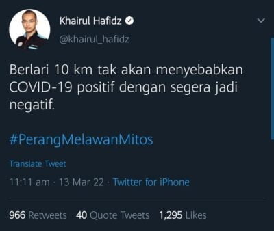 Dr Khairul Hafidz di Twitter menegaskan bahawa berlari 10 KM tidak akan menyebabkan status Covid-19 yang positif, dengan segera berubah jadi negatif.