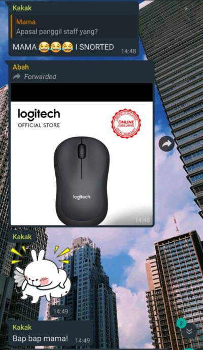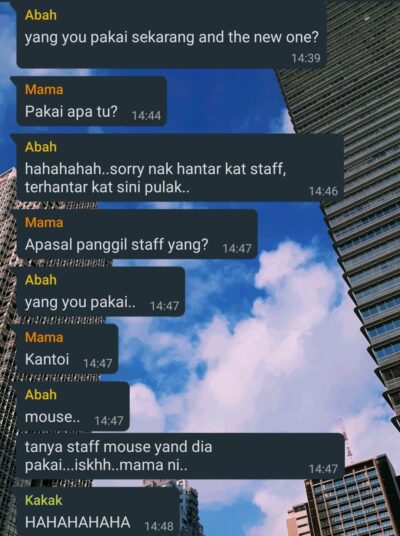 “Yang you pakai sekarang and the new one?” tulis ayah gadis ini menerusi grup Whatsapp tersebut. Rupa-rupanya mesej tersebut hendak dihantar ke staff pejabat. Situasi cemas dan lucu apabila ibunya membalas dengan mengatakan “Apasal panggil staff yang?.”