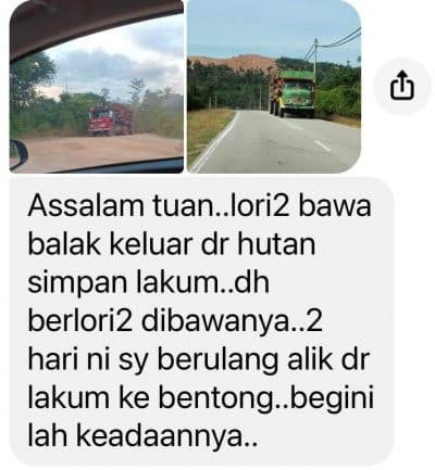 Petang ini saya menerima mesej beserta gambar daripada penduduk di DUN Lanchang mengenai lori balak berduyun-duyun keluar membawa balak dari Hutan Simpan Lakum sejak tiga hari lalu.