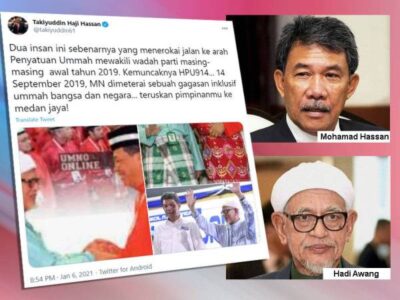 Setiausaha Agung Pas, Datuk Takiyuddin Hassan telah memuat naik foto Presiden Pas, Datuk Seri Abdul Hadi Awang bersama Timbalan Presiden UMNO, Datuk Seri Mohamad Hasan yang dirakam ketika Himpunan Ummah di Twitternya pada Rabu.