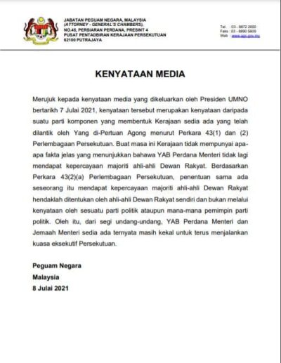 Merujuk kepada kenyataan media yang dikeluarkan oleh Presiden UMNO bertarikh 7 Julai 2021, kenyataan tersebut merupakan kenyataan daripada suatu parti komponen yang membentuk Kerajaan sedia ada yang telah dilantik oleh Yang di-Pertuan Agong menurut Perkara 43(1) dan (2) Perlembagaan Persekutuan.