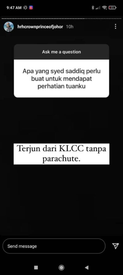 Tunku Mahkota Johor, Tunku Ismail Sultan Ibrahim malam tadi membuat sesi Q dan A di laman sosial miliknya di Instagram story.