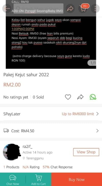 Mungkin tak nak terlepas peluang untuk turut berniaga sempena bulan puasa nanti, nampaknya ada yang sudah mula menjual perkhidmatan kejut sahur dekat Shoppee.
