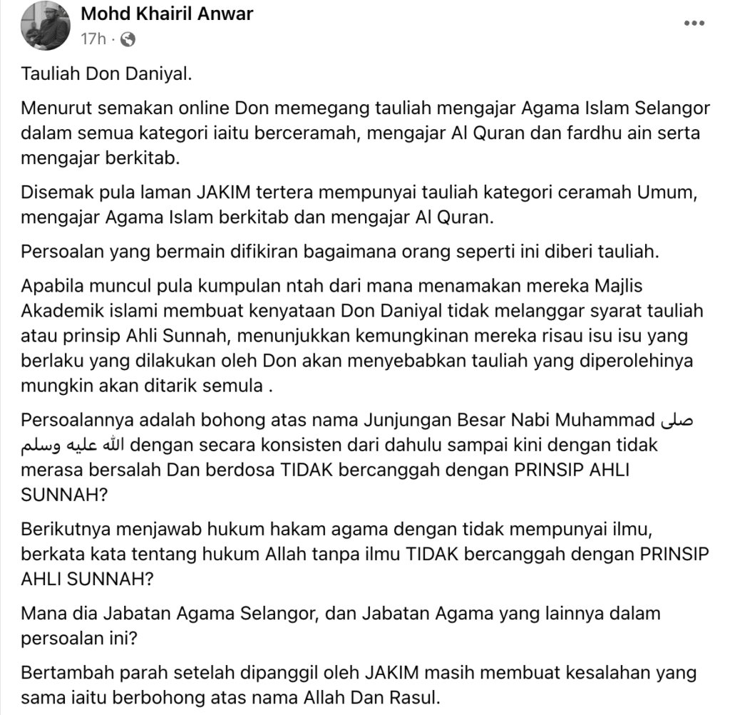 Menurut seorang pengguna media sosial Facebook yang dikenali dengan nama Mohd Khairil Anwar, dia turut mempersoalkan tauliah yang diberikan kepada penceramah itu.