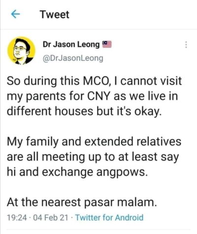 Seorang pengguna twitter harini trending dengan ciapanya di twitter mengenai keputusan kerajaan membuka pasar malam dalam waktu PKP, tapi tak boleh berkunjung ke rumah saudaranya walaupun satu taman di rumah sempena tahun baru cina ini.
