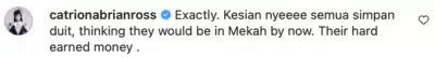Bagi Catriona, dia berasa sedih apabila mengenang susah payah para jemaah untuk mengumpul duit demi ke Tanah Suci.