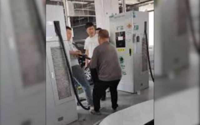 Kereta EV semakin banyak, pengecas tak cukup- Dua lelaki bergelut berebut alat cas kereta elektrik