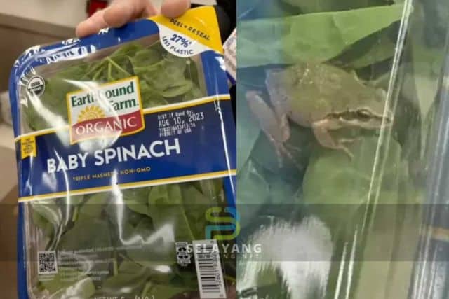 Walau dibasuh tiga kali mustahil katak masih hidup dalam bungkusan bayam-Wanita ini terkejut jumpa katak