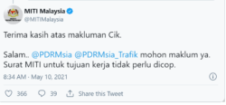 Kekeliruan SOP : MITI hanya bagi arahan pada Polis di Twitter
