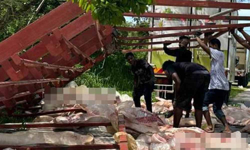 50 ekor babi bergelimpangan atas jalan di Kelantan selepas lori kemalangan