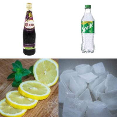 - Tuangkan air Sprite dan sedikit air Ribena sebagai penyeri warna.
