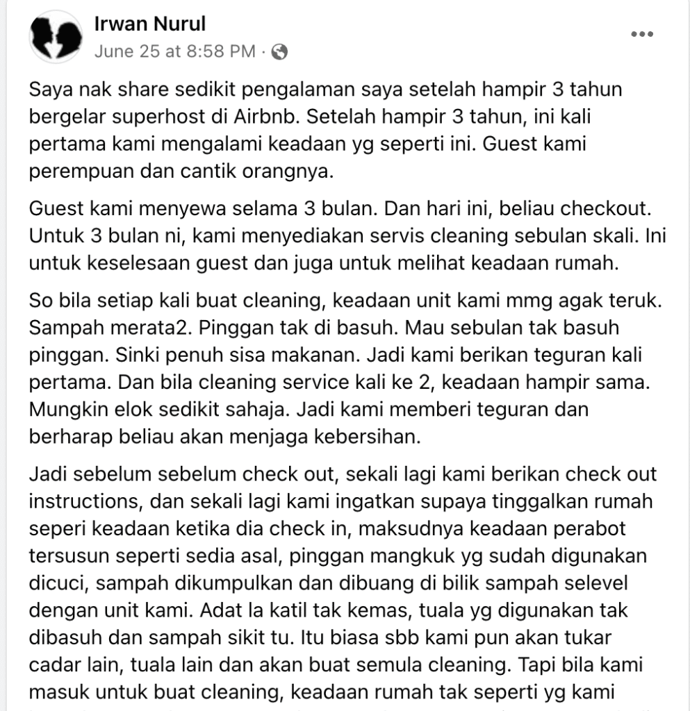 Atas sebab itu, Superhost iaitu Irwan Nurul telah menghubungi pihak Airbnb untuk meminta claim supaya dapat melakukan pembersihan ke atas rumah beliau.