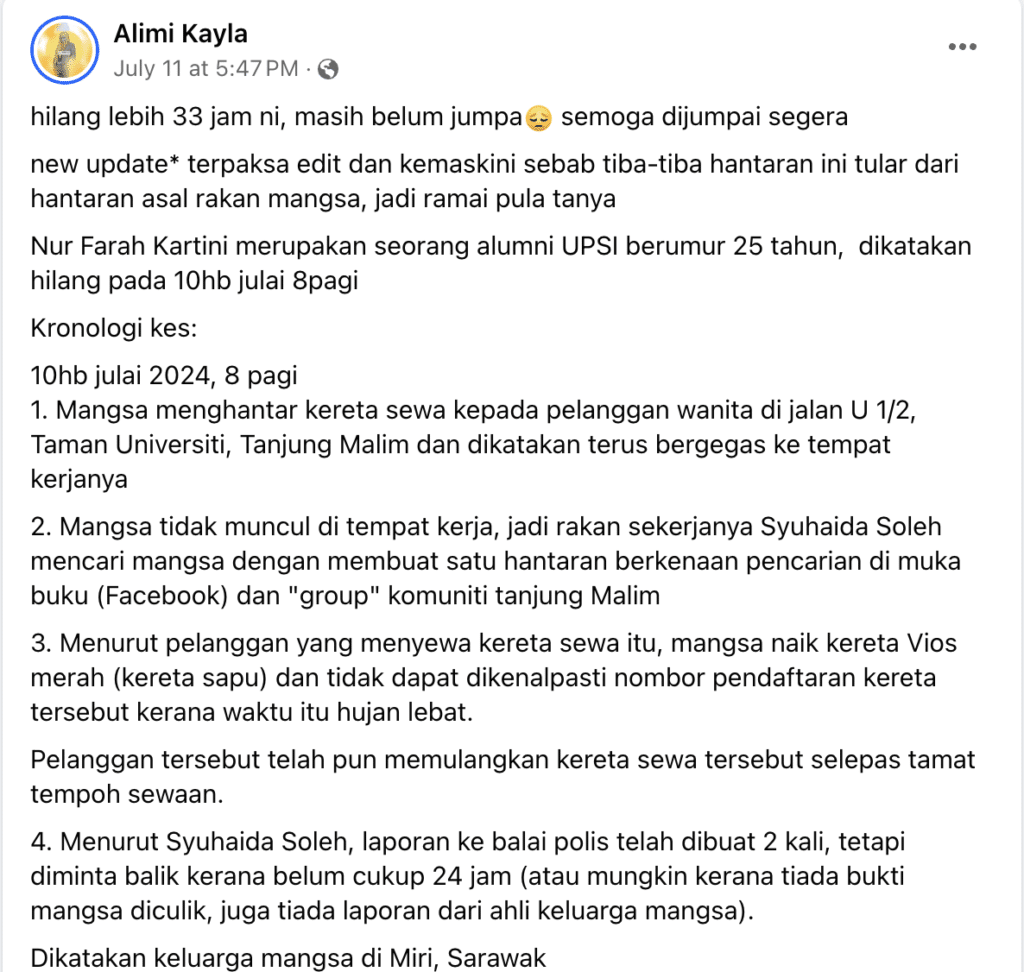 Hantaran yang tular ketika mangsa belum ditemui itu turut mendedahkan bagaimana rakan-rakan mangsa mencari dan menularkan maklumat berkenaan Nur Farah Kartini.