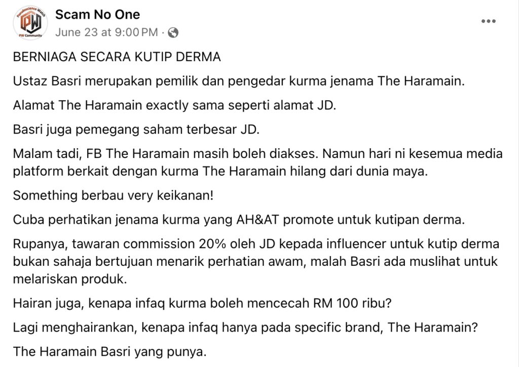 Sebuah laman sosial Facebook iaitu Scam No One mendedahkan Ustaz Basri menggunakan platform derma untuk melakukan kurma miliknya sendiri.