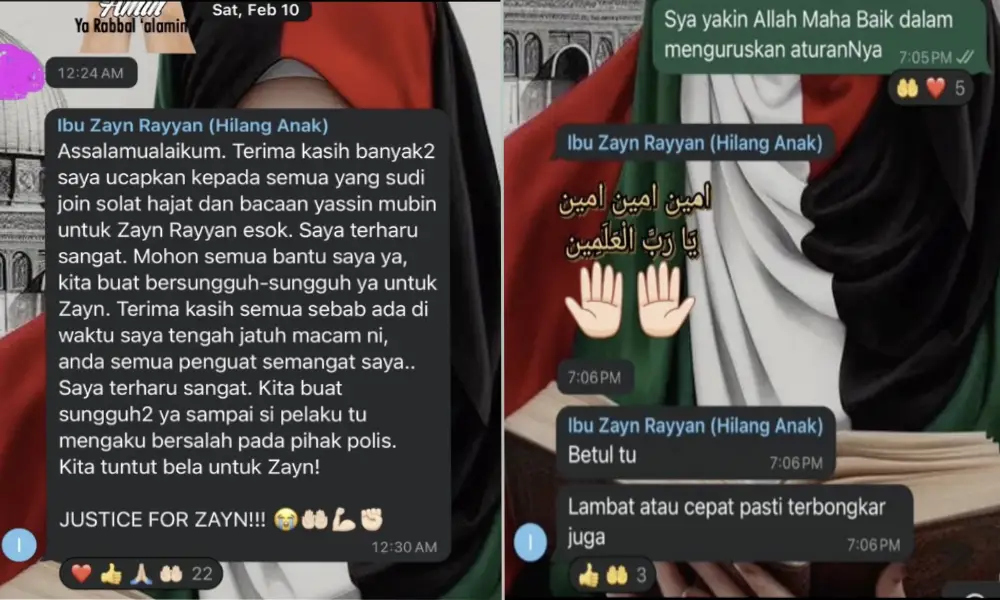 “Group solat hajat ni sya create utk bersama-sama sahabat yang lain termasuk ibu zayn sekali ada join dlm gp tu buat solat hajat dan bacaan yassin mubin utk permudahkan urusan kes arwah zayn.”