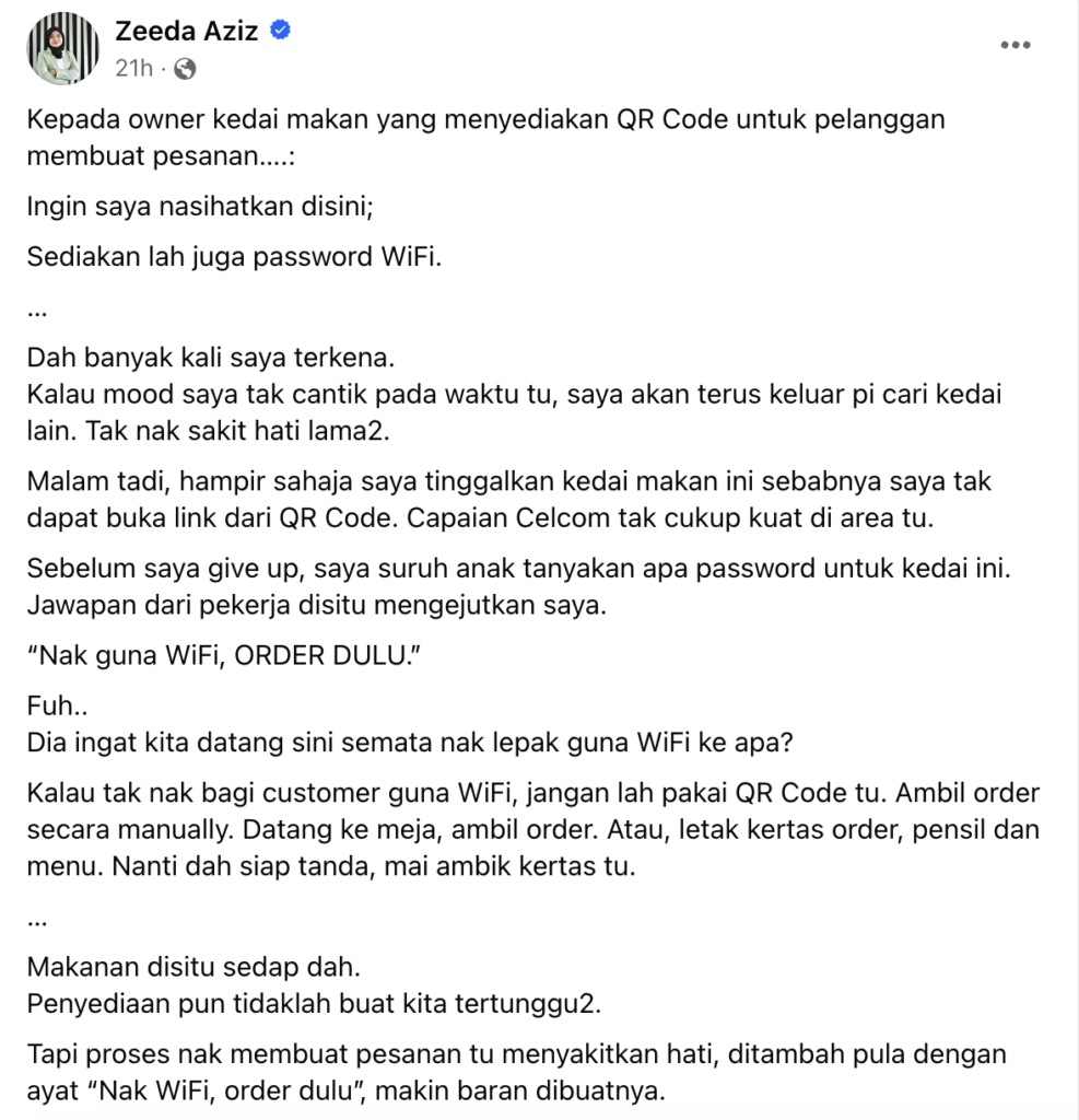 “Malam tadi, hampir sahaja saya tinggalkan kedai makan ini sebabnya saya tak dapat buka link dari QR Code. Capaian Celcom tak cukup kuat di area tu.”