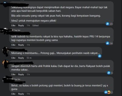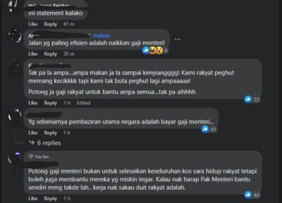 “Potong gaji menteri bukan untuk selesaikan keseluruhan kos sara hidup rakyat tetapi boleh juga membantu mereka yang miskin tegar. Kalau nak harapkan menteri bantu sendiri memang tak ada, kerja nak ambil duit rakyat adalah,” antara komen netizen